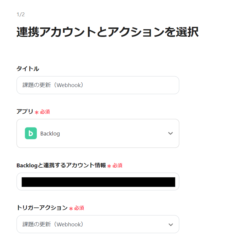4) アクションは「課題の更新(Webhook)」を選択して、「次へ」をクリックします。