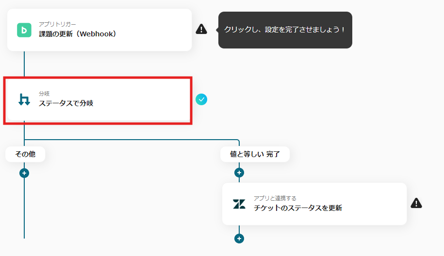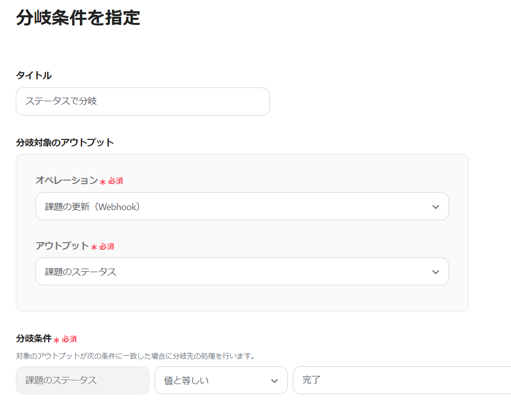 分岐条件は、「課題のステータス」「値と等しい」「完了」になっていることを確認し、「保存」します。