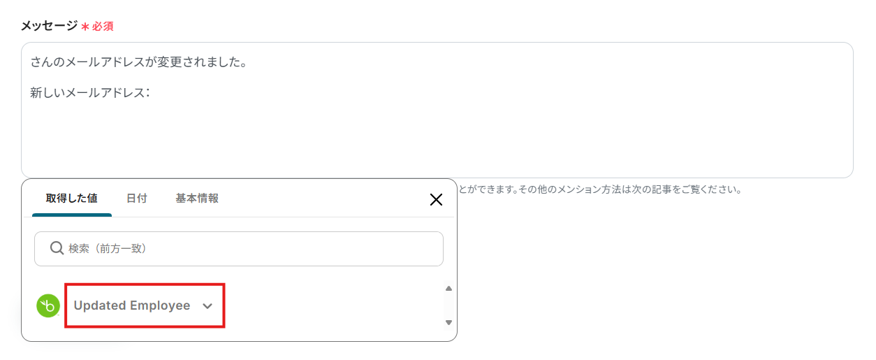項目をクリックすると、入力欄に{{項目名 取得した値}}という形で追加されます。