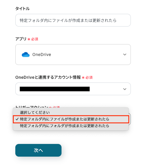 トリガーアクション:「特定フォルダ内にファイルが作成または更新されたら」を選択