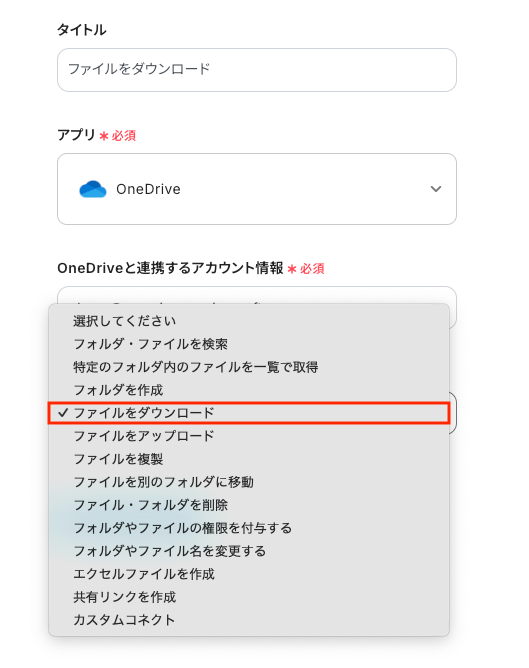 作成されたファイルの内容をOCRで読み取るにあたって、OneDriveからファイルをダウンロードするための設定をします。 三つ目のオペレーションにある、「ファイルをダウンロード」をクリックしてください。