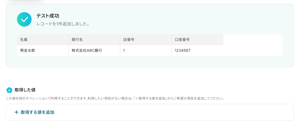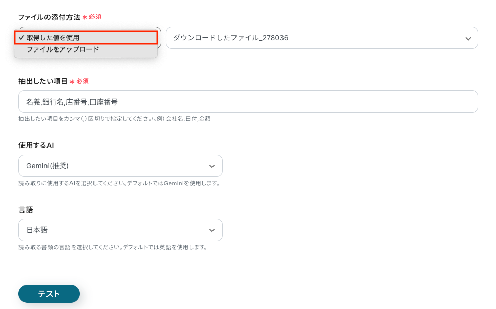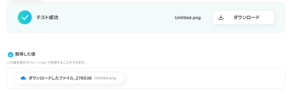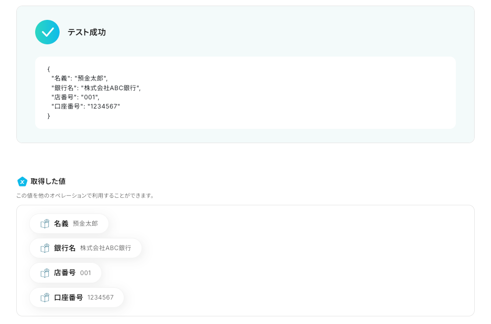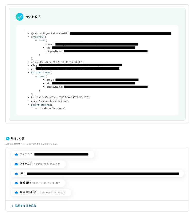 アップロードができたらテストボタンをクリックしましょう。テストが成功すると以下のように「取得した値 」が表示されます。 「取得した値」は、後のフローで使用するデータとなります。