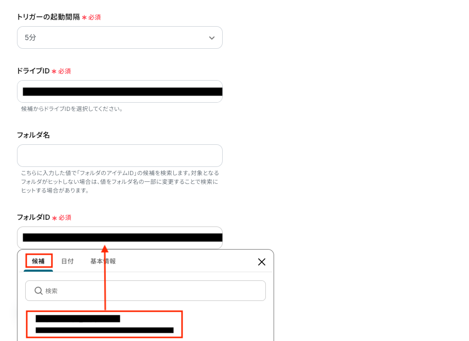 次に「ドライブID」「フォルダID」をそれぞれ候補から選択します。 候補は連携しているアカウントに基づいて表示されるため、OCRを行うファイルをアップロードしてMicrosoft Excelと連携するドライブIDなどを選択してください。