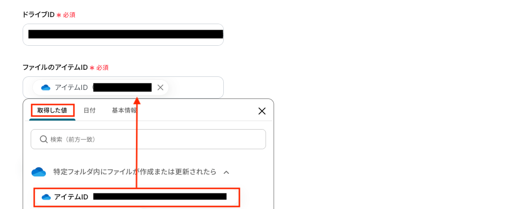 ・ドライブID/サイトID:欄をクリックし、OneDriveの場合はドライブID、SharePointの場合はサイトIDを選択します。