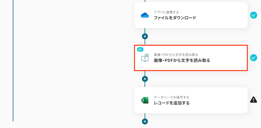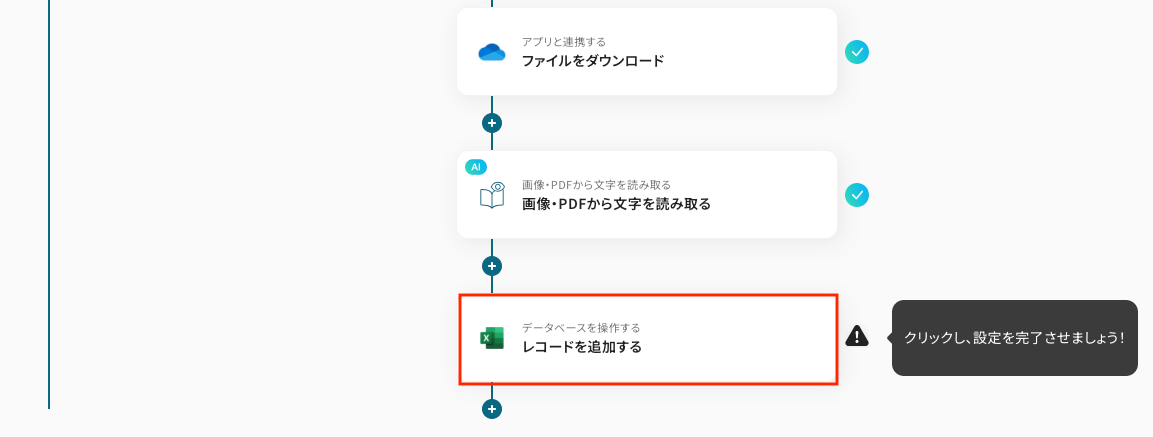 OneDriveのトリガー設定では、対象としたいフォルダを任意で設定してください。 AI-OCRで文字を読み取るアクションでは、読み取り対象のファイルや、抽出したい項目、言語などを任意で設定してください。 Microsoft Excelにレコードを追加するアクションでは、連携するデータベースや、追加したいレコードの値を任意で設定してください。 ■注意事項
