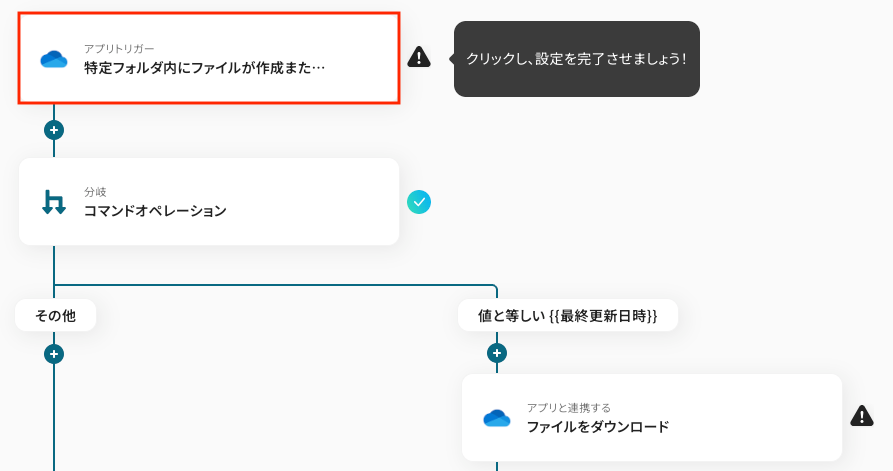 ここからは、フローの起点となるトリガーアクションの設定です。 一つ目のオペレーションにある、「特定フォルダ内にファイルが作成または更新されたら」をクリックしてください。