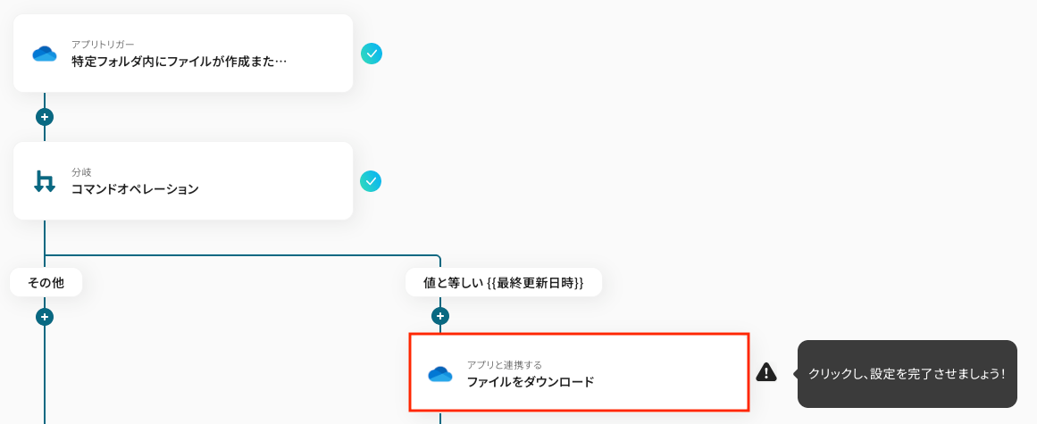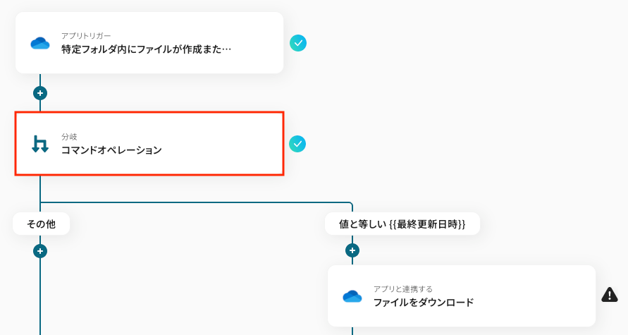 ※作成日時と最終更新日時が等しい=ファイルが作成された場合のみフローが起動します。なお、分岐条件の「最終更新日時」には取得した値を使用することで、毎回最新のファイル情報が反映されます。取得した値はボックスをクリックし、OneDriveのトリガーから挿入可能です。