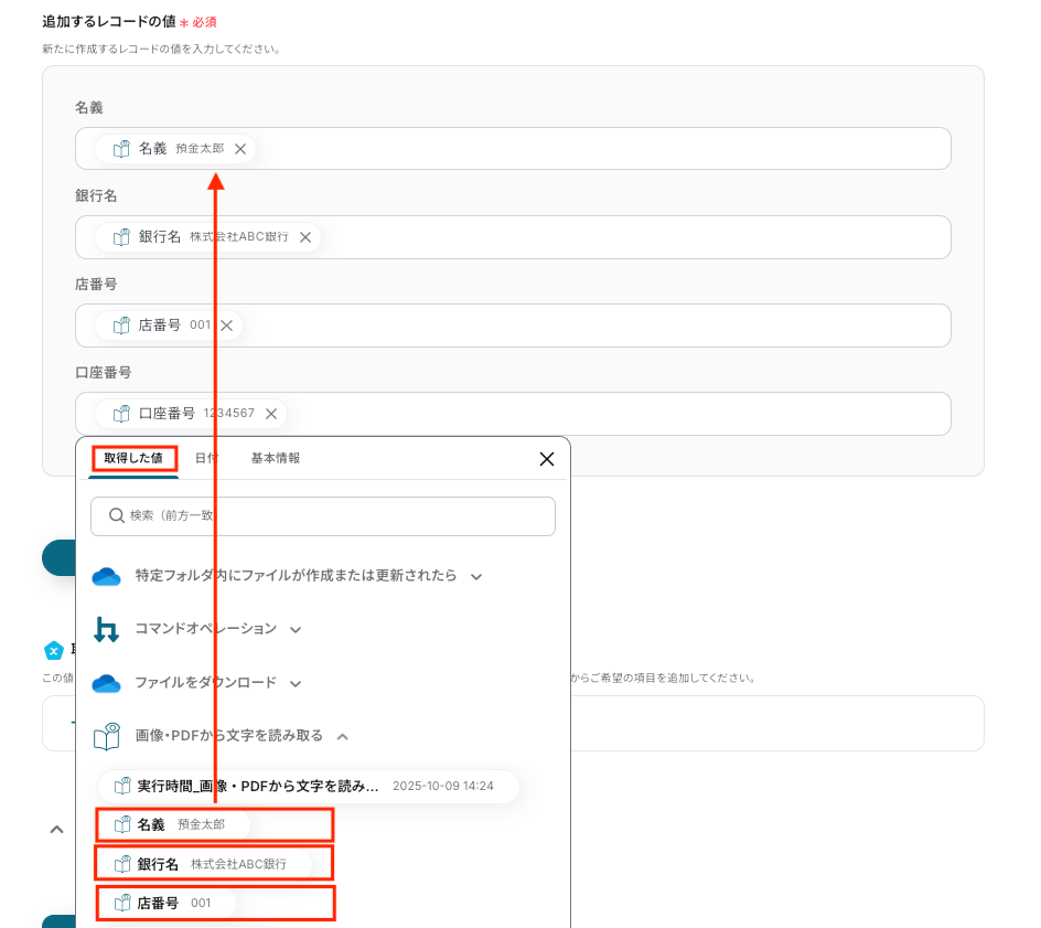 ・追加したいレコードの値:表示された列名に対応する値を①で取得したアウトプットを使って埋め込みます。