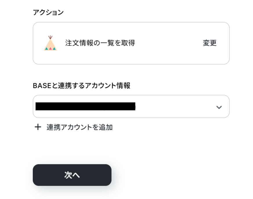 - 次に、オペレーションでBASEを選択し、「注文情報の一覧を取得」するアクションを設定します。