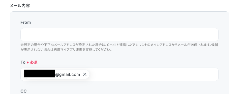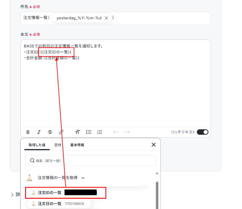 - Gmailでメールを送信するアクションでは、宛先(To, Cc, Bcc)や件名、本文を自由に設定できます。また、BASEから取得した注文内容を変数として本文に自動で差し込むことも可能です。