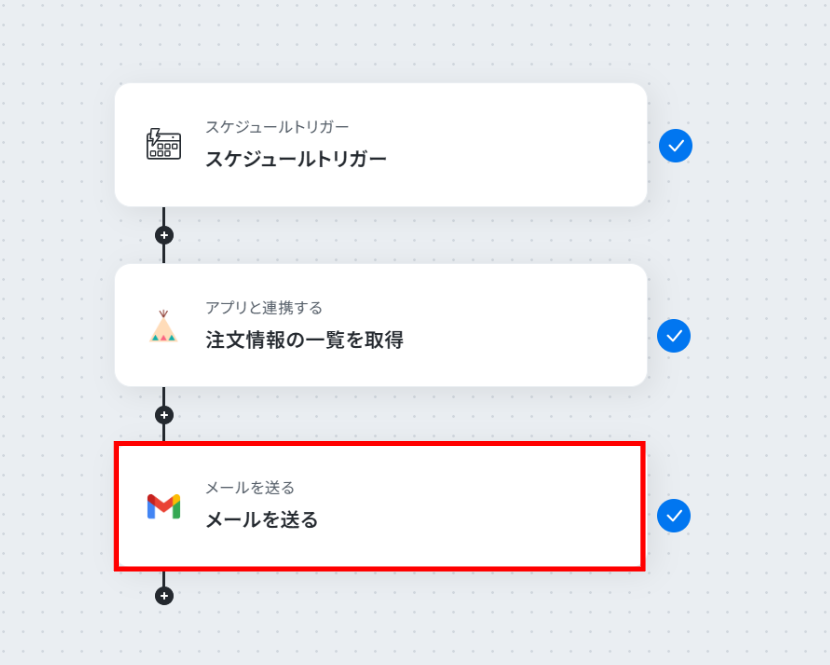 - 最後に、オペレーションでGmailの「メールを送る」アクションを設定し、取得した注文情報を記載したメールを指定の宛先に送信します。