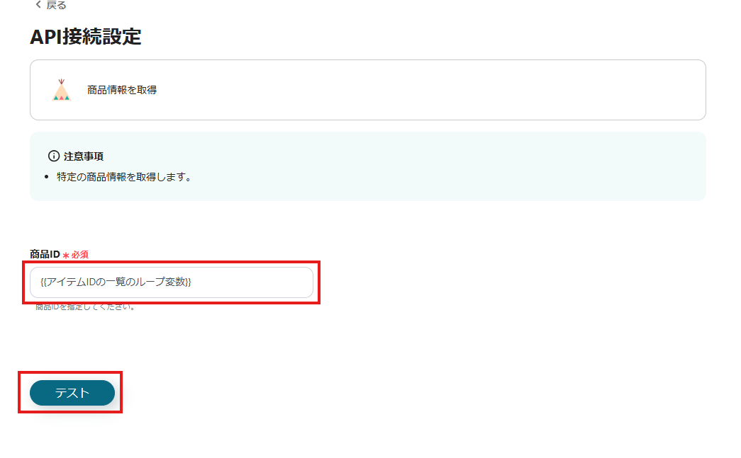商品IDの項目に、自動で「アイテムIDの一覧のループ変数」と出てきますので、