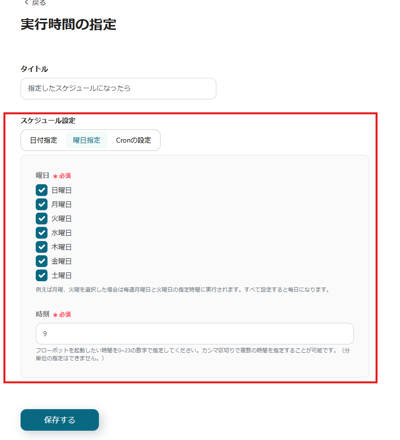 スケジュール設定から実行時間の指定をします。デフォルトで、月曜日から日曜日の9時に実行するように設定されています。
