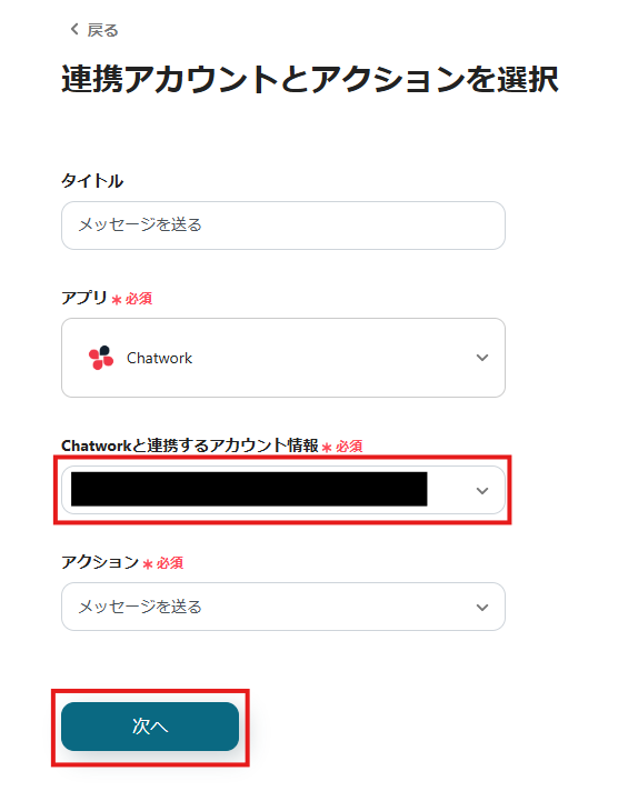 Chatworkと連携するアカウント情報に間違いないか確認し、「次へ」をクリックします。