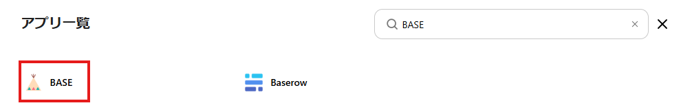 次に、検索窓にBASEと入力し、表示された候補から「BASE」を選択します。