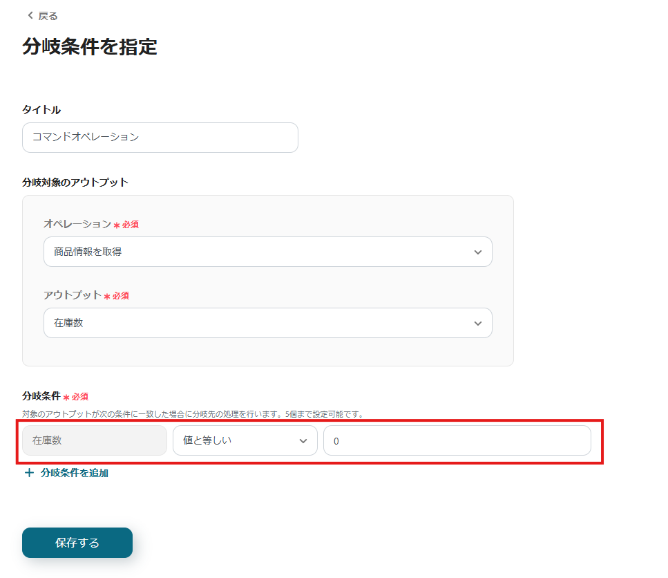 また分岐条件に関しては、今回売り切れがあった際に通知がくるようにするため、在庫数が「0」となっています。