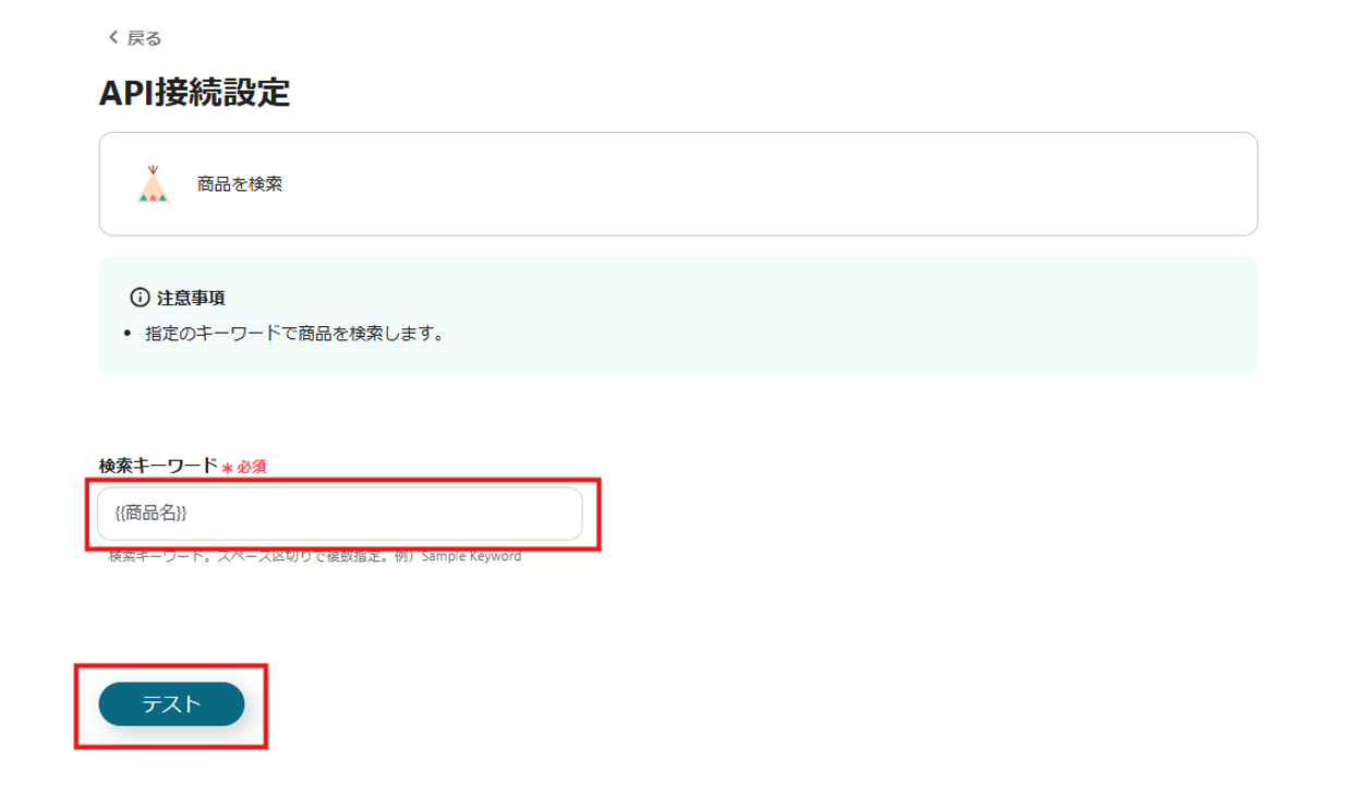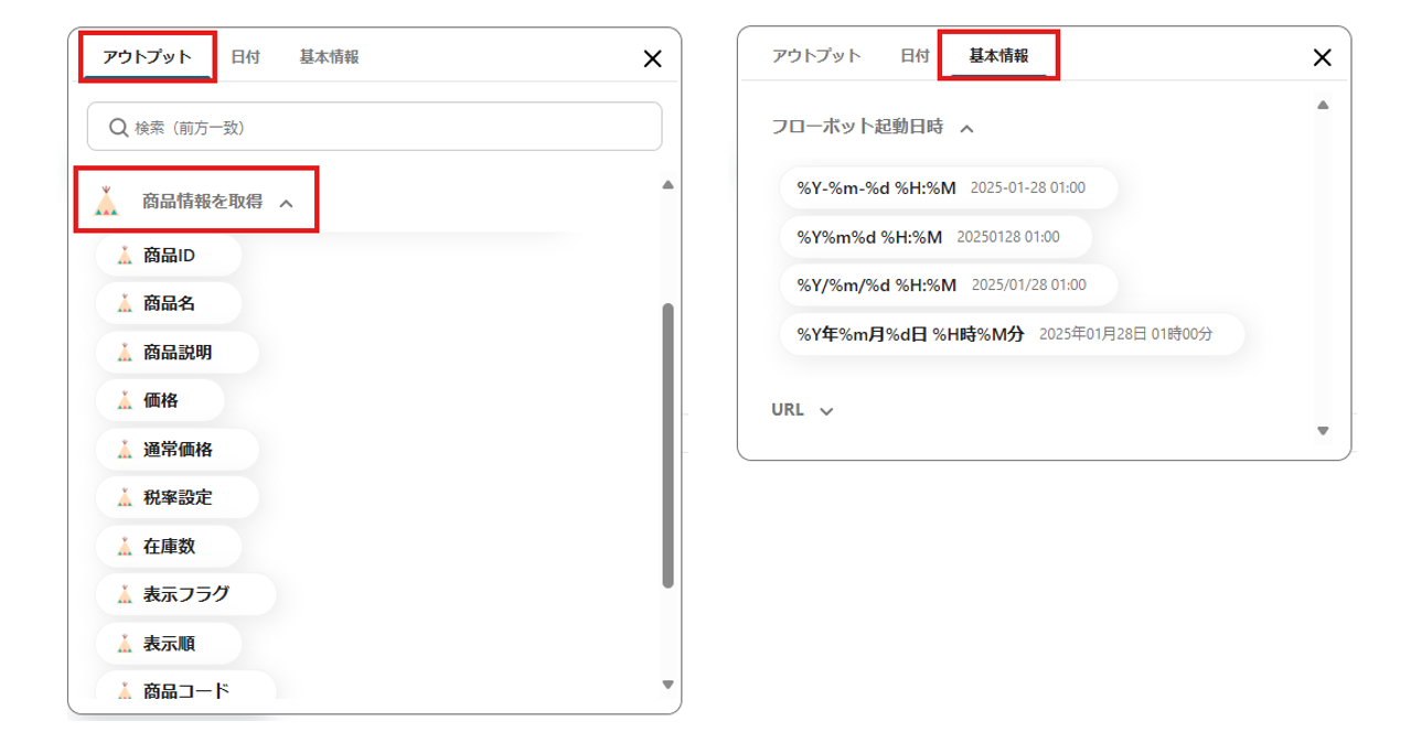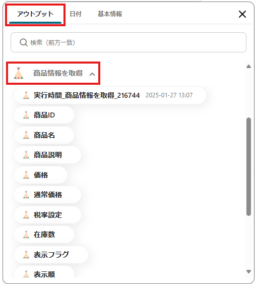 検索キーワードをクリックすると、「アウトプット」から「商品情報を取得」と出てきますので、