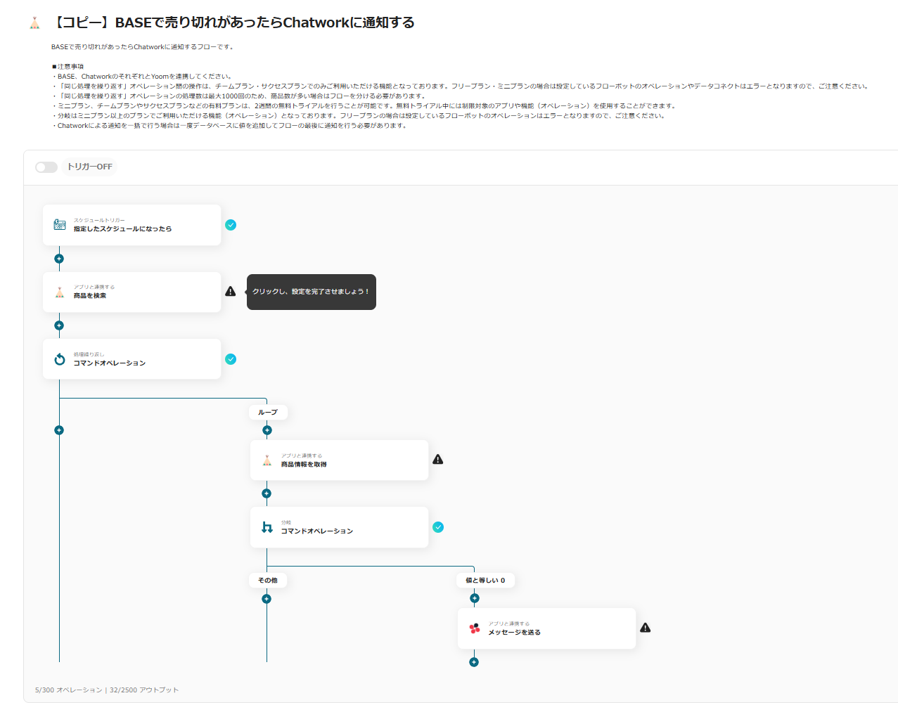 ・フローの起点となるBASEのトリガー設定と、Chatworkオペレーション設定