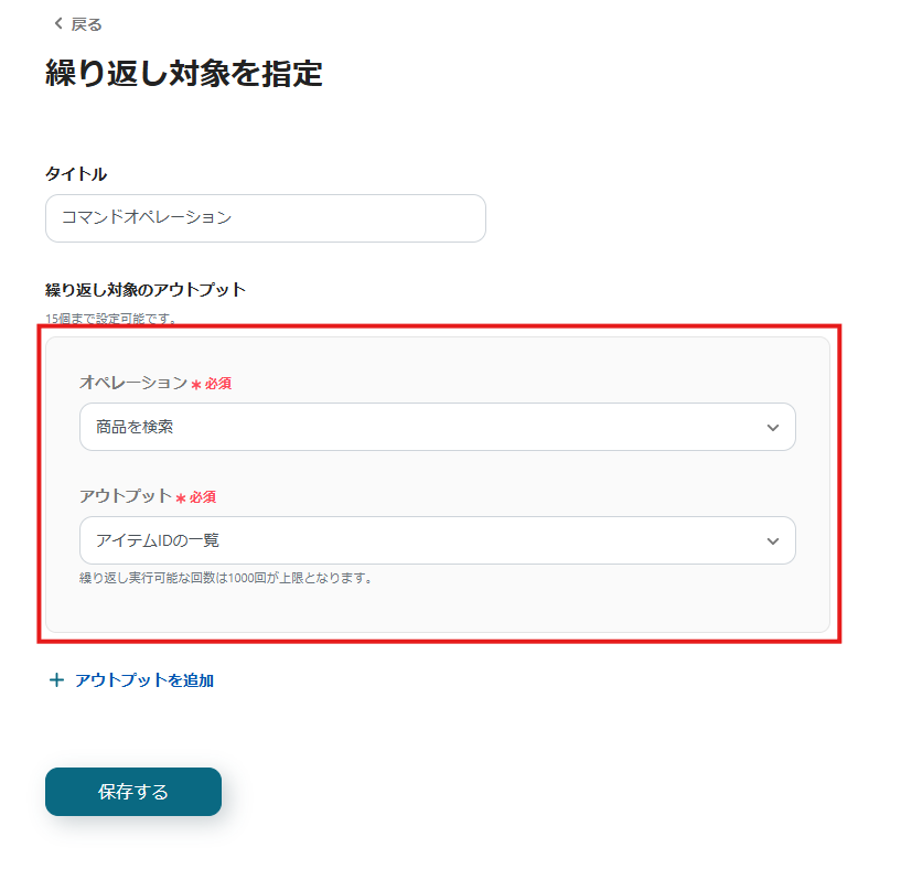オペレーションとアウトプットに自動で繰り返し対象が入ってきますので、