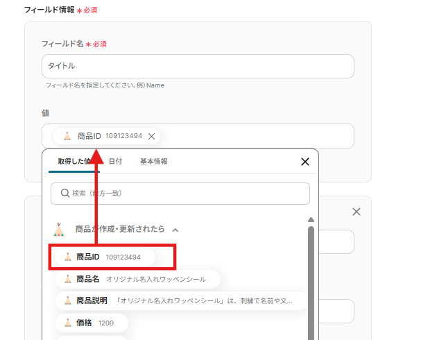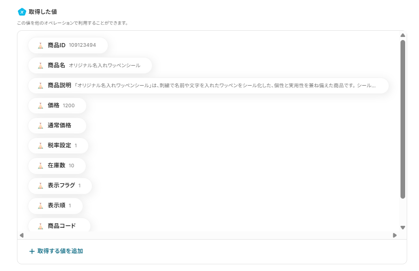 値には表示される取得した値から、BASEの情報を選択し、入力しましょう。
