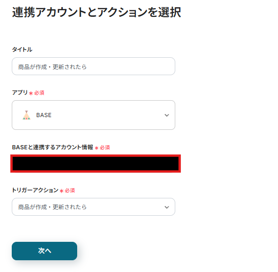 連携アカウントとアクションを選択する画面が表示されるので、今回連携するBASEのアカウントを確認し「次へ」をクリックします。