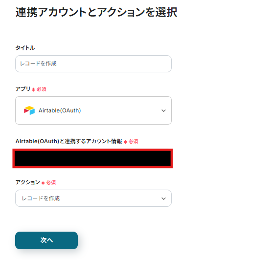 連携アカウントとアクションを選択する画面が表示されるので、今回連携するAirtableのアカウントを確認し「次へ」をクリックします。