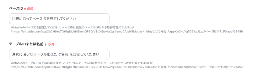 以下の画面が表示されるので、注釈に従ってベースID、テーブルIDを入力しましょう。