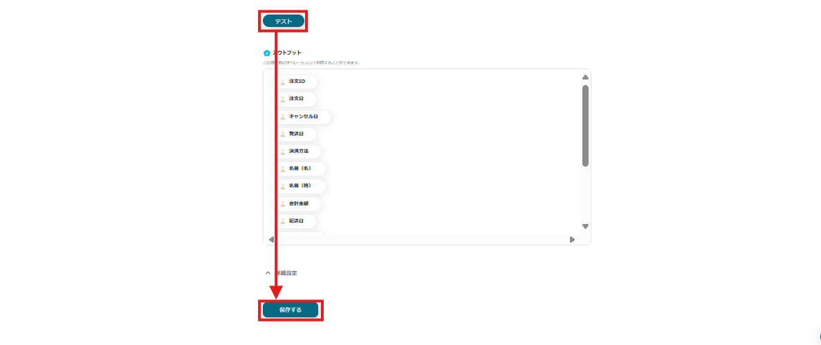 テストが成功すると、先ほど登録したBASEの注文情報がアウトプットとして取得されます。