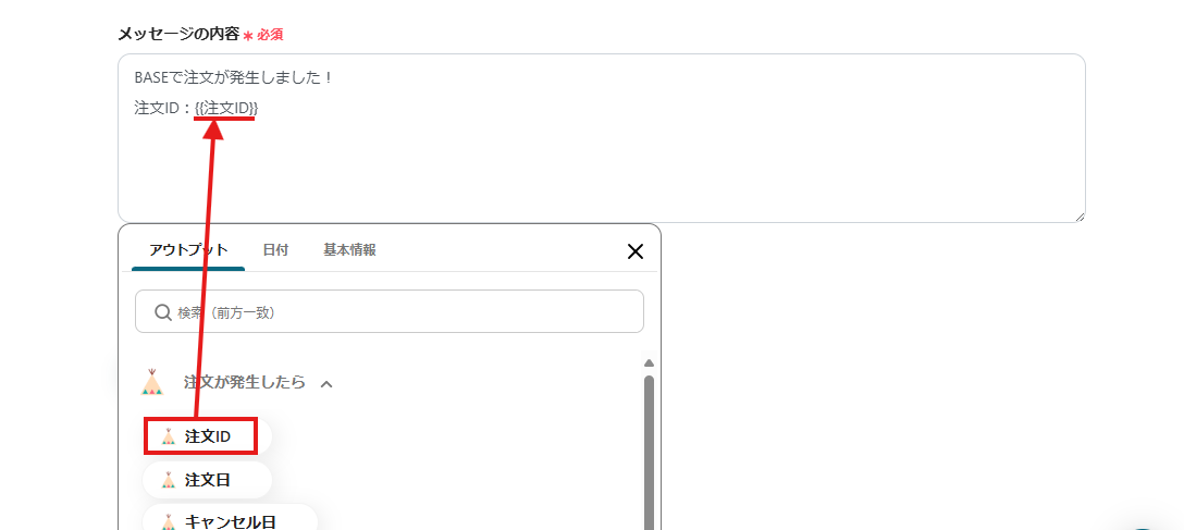 例えば、上記画面のように設定すると、BASEに注文がされたら「注文ID」を自動取得し、directに引用しメッセージを投稿できます。