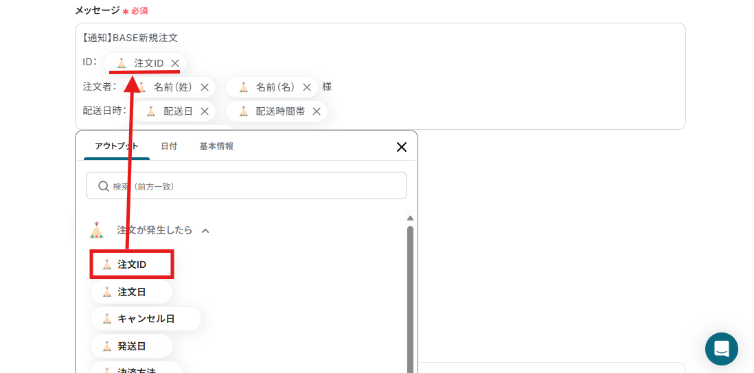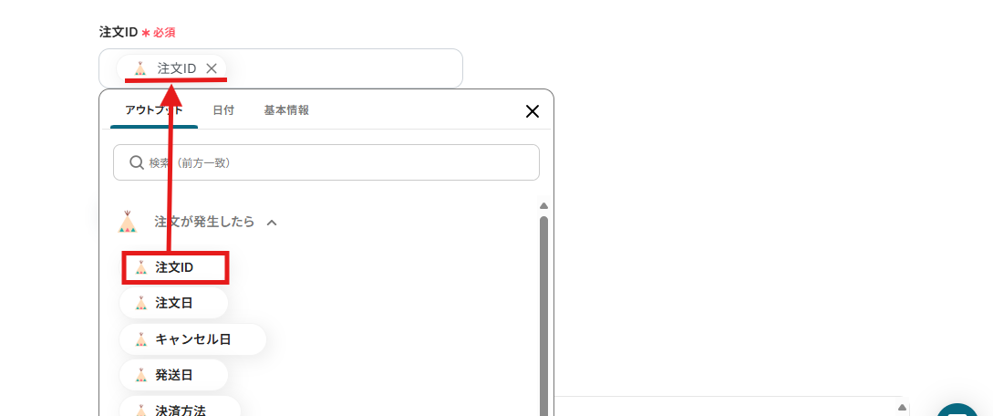 トリガー設定時に取得したアウトプットを用いて設定することで、BASEで注文が発生した際の「注文ID」から注文情報を自動で取得できます!