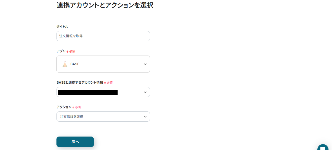 次に、BASEの注文情報を取得する設定です。BASEアイコンの「注文情報を取得」という項目をクリックしてください。