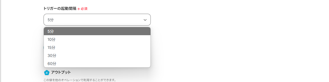 トリガーの起動間隔を選択します。5分、10分、15分、30分、60分のいずれかを選択することが可能です。基本的にはご利用のプランの、最短の起動間隔にして使用することをおすすめします!