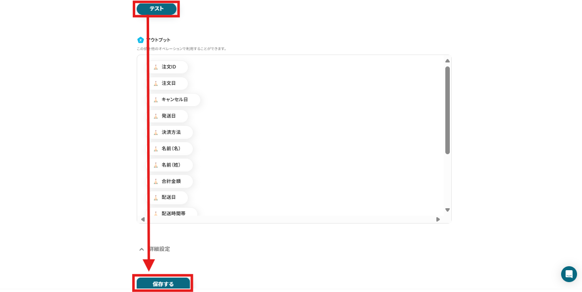 設定後に「テスト」をクリックし、注文情報がアウトプットとして取得されることを確認してください。確認後に保存しましょう。