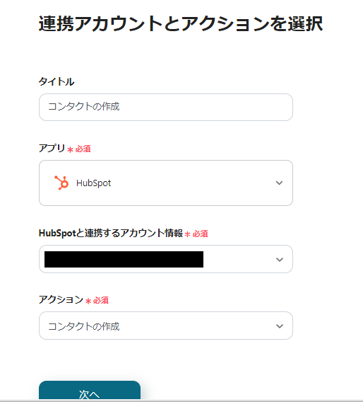 アクションが、「コンタクトの作成」であることを確認し、「次へ」をクリックしてください。