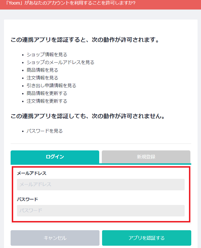上記画面が表示されたら、メールアドレスとパスワードを入力し、「アプリを認証する」をクリックしてください。