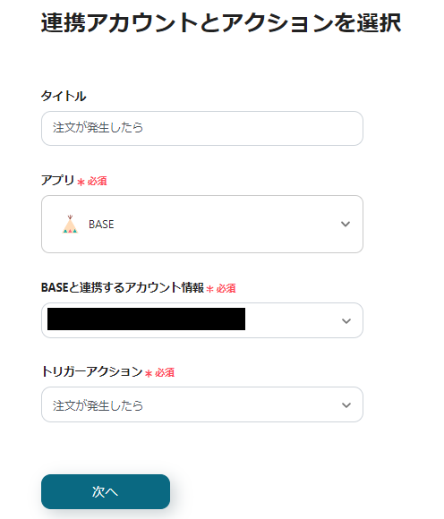 トリガーアクションが、「注文が発生したら」であることを確認し、「次へ」をクリックしてください。