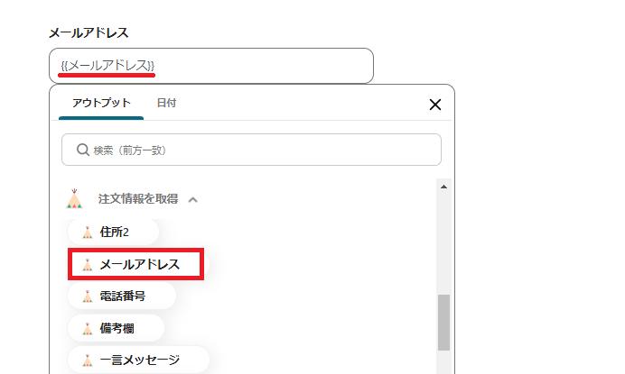 ※設定方法)枠内をクリックし、「注文情報を取得」の中にある「メールアドレス」をクリックしてください。メールアドレスの欄に、{{メールアドレス}}と入力されます。