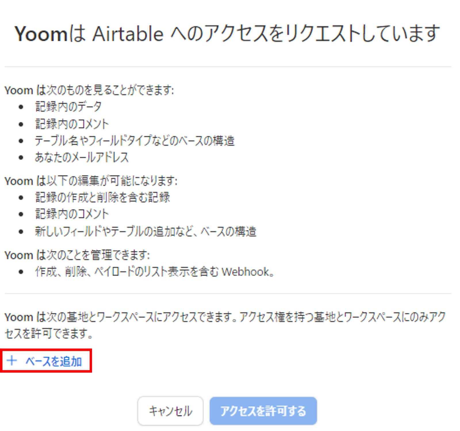 (4)「ベースを追加」をクリックし、該当するものを選択後、「アクセスを許可する」をクリックすればマイアプリ連携が完了です。
