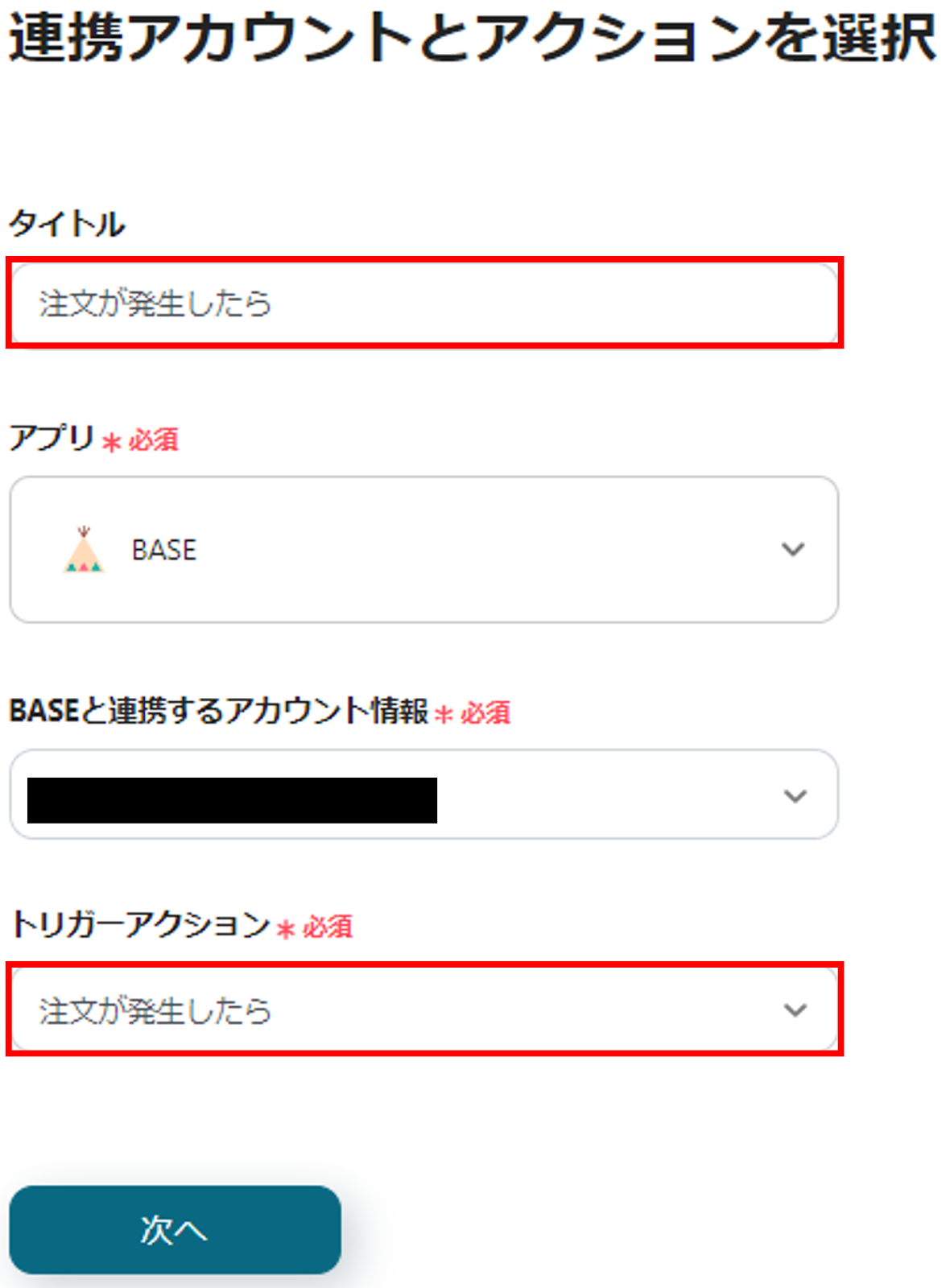 (2)タイトルを設定し、トリガーアクションに「注文が発生したら」が選択されていることを確認したら「次へ」をクリックします。