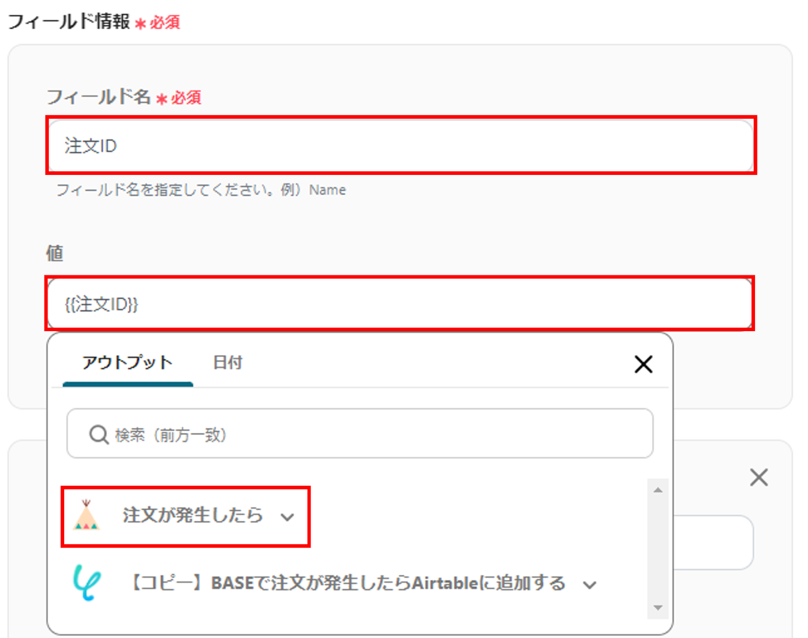 (3)API接続設定画面で、ベースID、テーブルIDまたは名前、フィールド情報を設定します。値には、「注文が発生したら」のアウトプットから該当するものを選択してください。