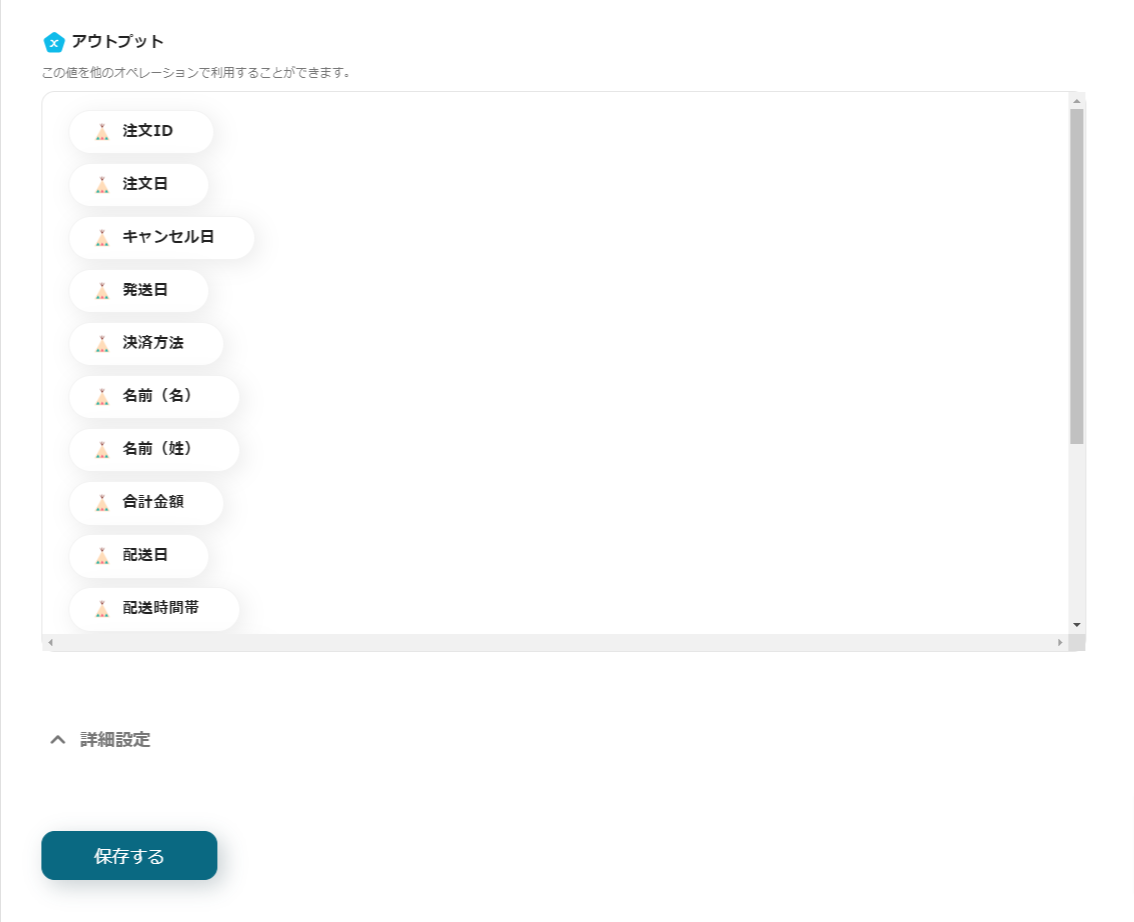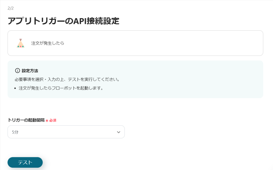 起動間隔を設定したら、BASEで仮の注文情報を入力した後に「テスト」をクリックしてアウトプットを取得しましょう。
