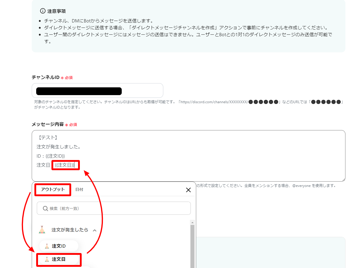 チャンネルIDとメッセージ内容を設定したら、指定したチャンネルにメッセージが届くかテストします。