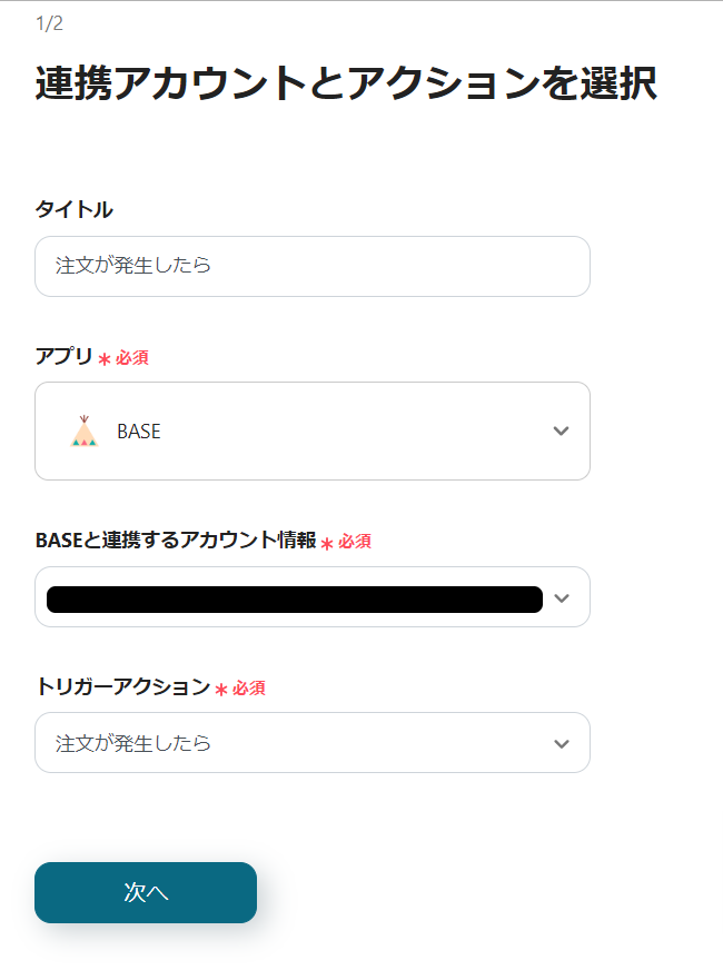 トリガーアクションは変更不可です。アカウント情報を確認したら次へ進んでください。