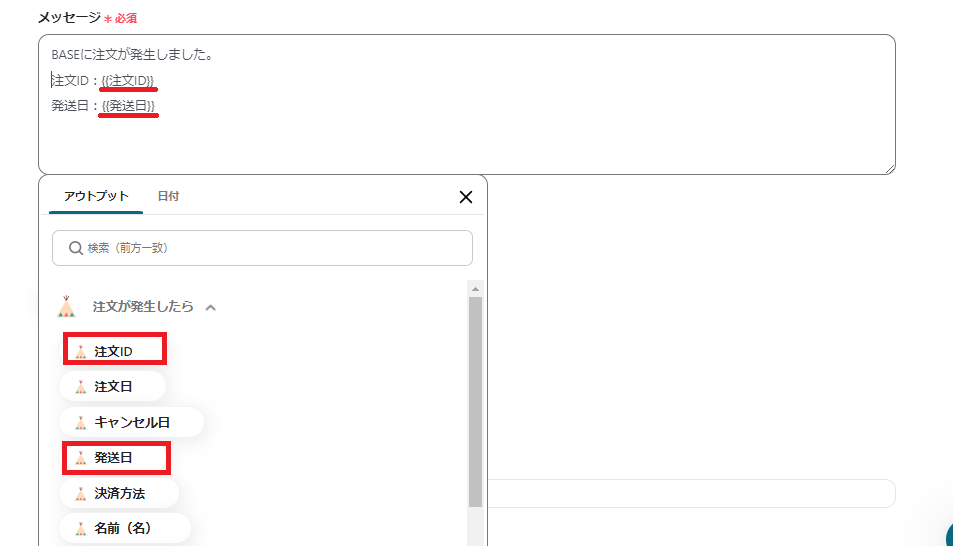 上記の設定例では、BASEで注文が発生すると、「注文ID」と「発送日」が自動取得され、LINE WORKSのメッセージに反映されます。
