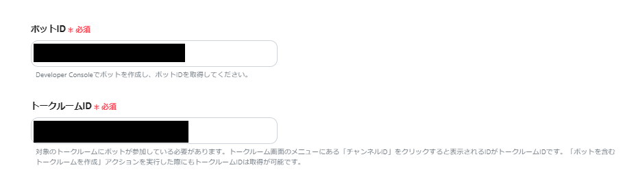 ボットIDとトークルームIDは、上記画面の注釈を参考に入力してください。