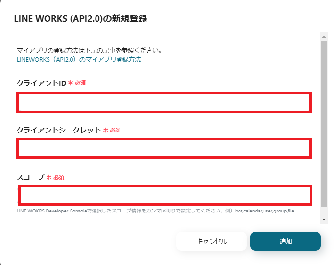 LINE WORKSの新規登録画面に、クライアントID・クライアントシークレット・スコープを入力し、「追加」をクリックしてください。