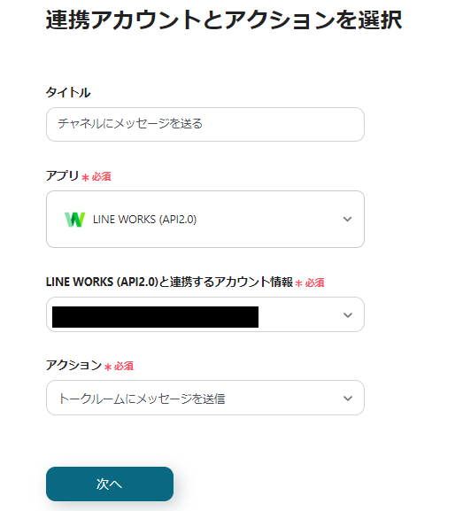 アクションは、「トークルームにメッセージを送信」が選択されていることを確認し、「次へ」をクリックしてください。