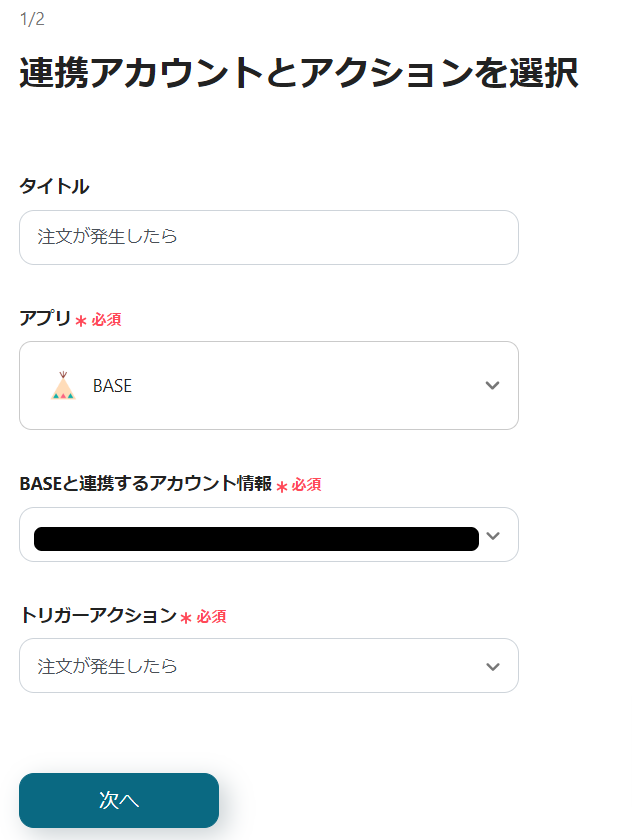 タイトルとトリガーアクションは変更不要なので、アカウント情報を確認したら「次へ」をクリックしてください。