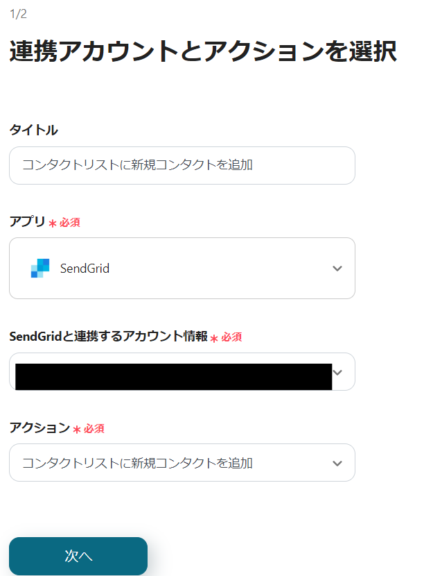 ・次に、SendGridで「コンタクトリストに新規コンタクトを追加」というアクションを設定
