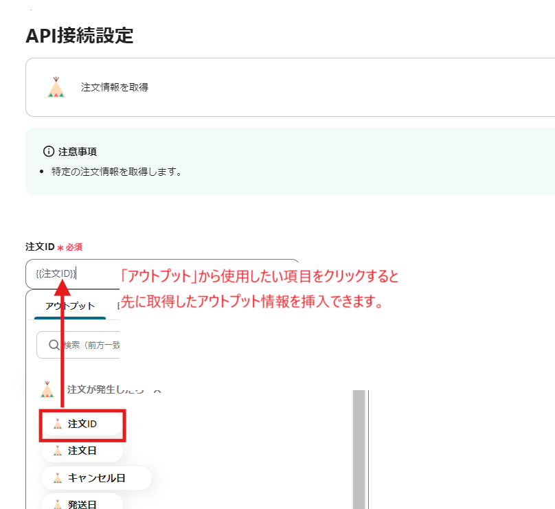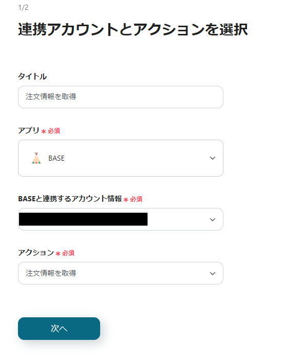 2) アクションは「注文情報を取得」を選択して、「次へ」をクリックします。